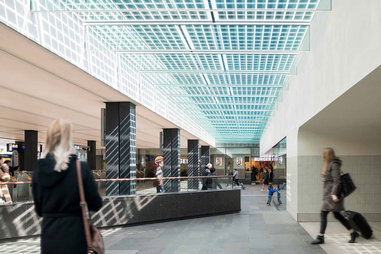 Veeger vult aan: “Hoewel de nieuwe reizigerspassage niet diep onder de grond ligt, is het wel een ondergrondse ruimte. Om ervoor te zorgen dat reizigers dit zo min mogelijk ervaren, hebben we naast het enorme lichtplafond – dat een oppervlakte heeft van ongeveer 1.700 vierkante meter – veel aandacht besteed aan daglichttoetreding. Zo zijn delen van de perrons boven de passage uitgevoerd in beloopbaar glas. Ook hebben we bij de uiteinden van de passage glazen vloerplaten met geïntegreerde zonnecellen toegepast. Deze steunen op glazen liggers waarin dunne led-lijnen zijn opgenomen. Verder hebben we alle perrontrappen voorzien van glazen stootborden.”