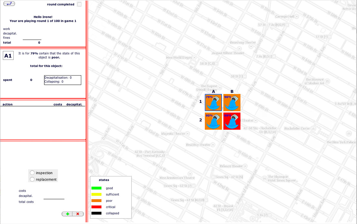 “Voor het onderzoek hebben we gebruikgemaakt van de serious game Maintenance in Motion. Dit is een digitaal spel dat we speciaal hebben ontwikkeld om het beheer van stedelijke infrastructuur na te bootsen. Spelers – beheerders van stedelijke infra – beheren in het spel elk hun eigen infrastructuur, zoals een drinkwater-, gas-, of rioleringsnetwerk of weg. Net als in het echt verouderen deze infrastructuren totdat ze falen. De beheerders moeten dit zien te voorkomen tegen zo gering mogelijke kosten. Ze kunnen steeds kiezen uit drie maatregelen: niets doen, inspecteren of vervangen.”