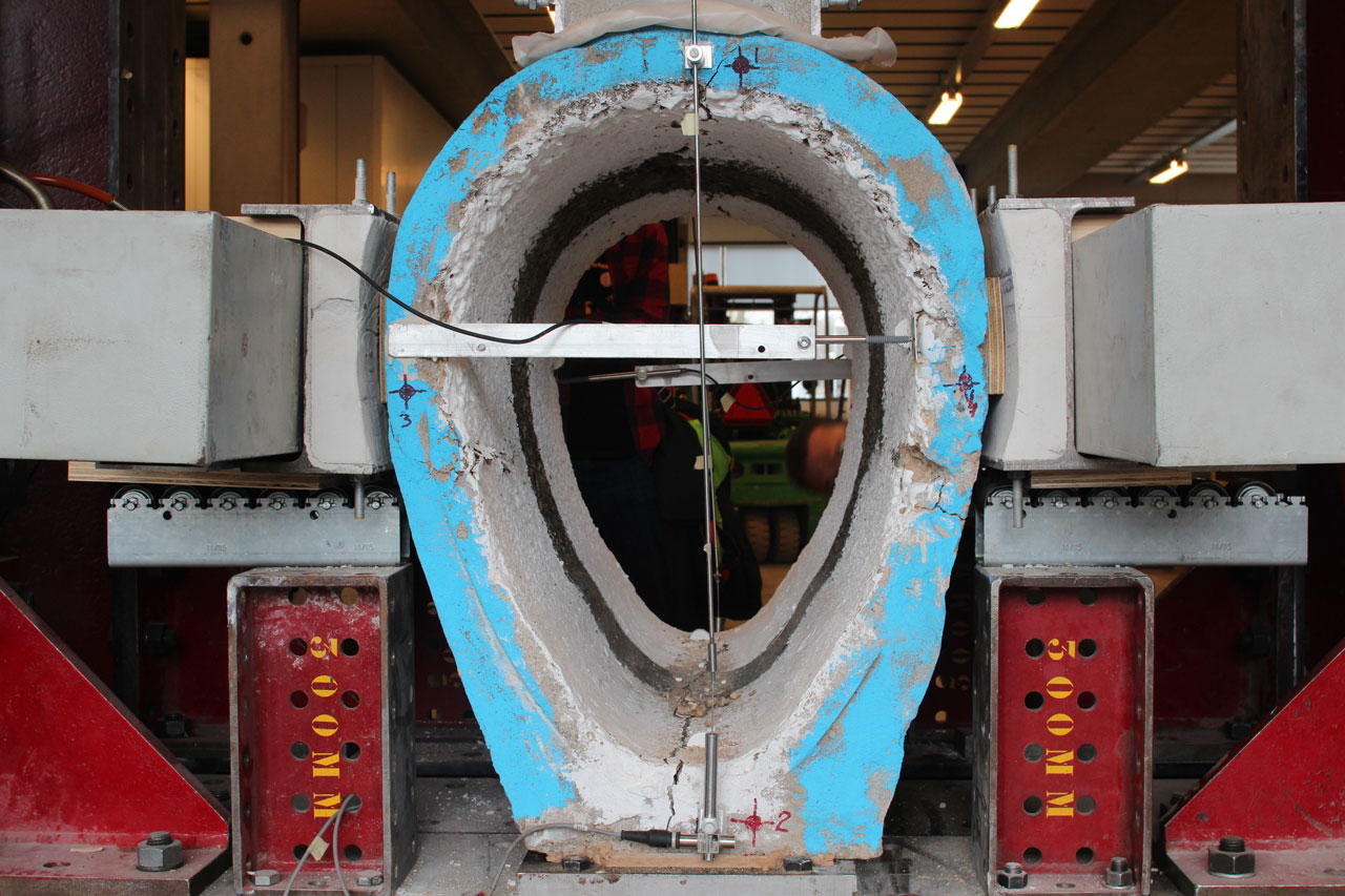 In het laboratorium testen onderzoekers van het kennisprogramma Urban Drainage de reststerkte van een oude betonnen rioolbuis. (Foto: Urban Drainage)