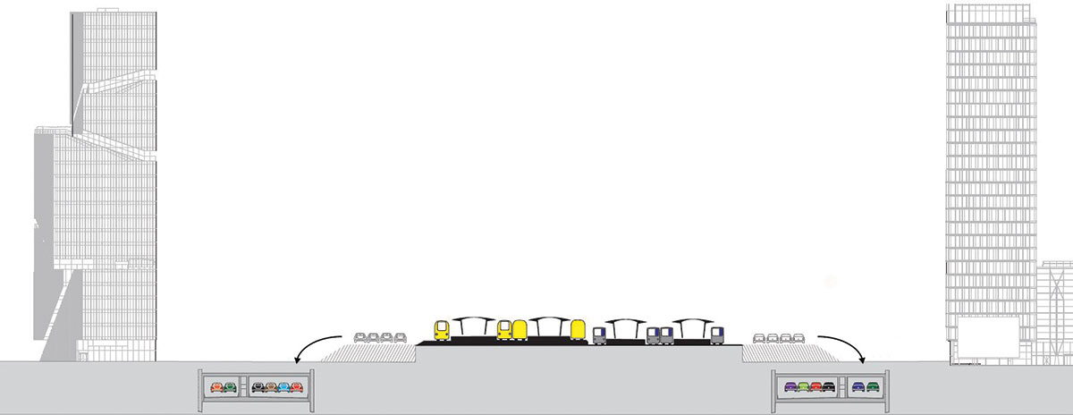 Hij illustreert dat met een doorsnede van het Katri Vala Park (zie figuur hiernaast). Daar werden sinds de jaren vijftig ondergronds achtereenvolgens opslagruimten, een multifunctionele leidingentunnel, een tunnel voor gezuiverd afvalwater en een warmtepompstation gerealiseerd. In het masterplan is onder dezelfde locatie ook nog ruimte gereserveerd voor toekomstig ondergronds gebruik. Het park is in al die tijd onaangetast gebleven.