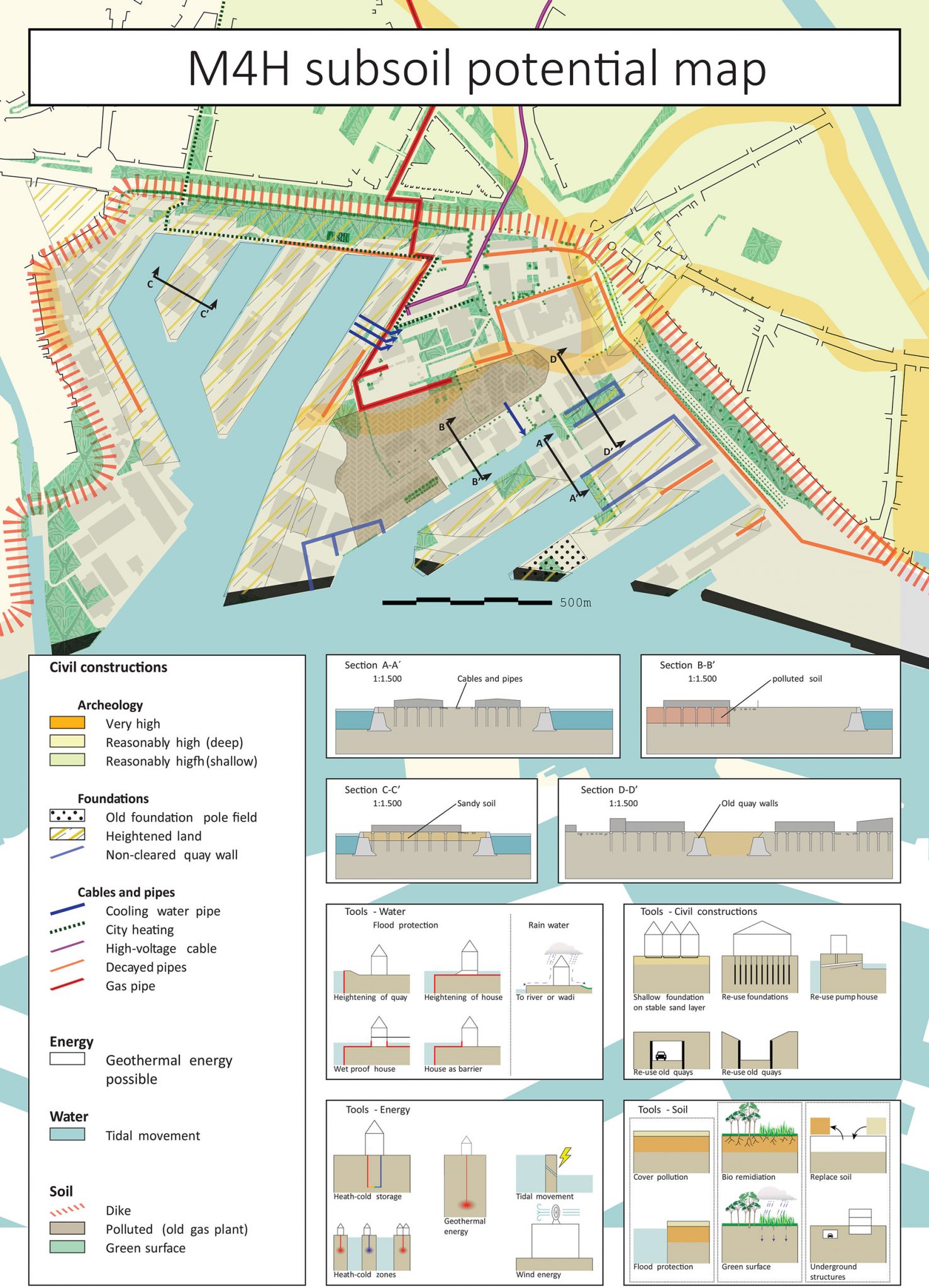 Hij illustreert dat met een doorsnede van het Katri Vala Park (zie figuur hiernaast). Daar werden sinds de jaren vijftig ondergronds achtereenvolgens opslagruimten, een multifunctionele leidingentunnel, een tunnel voor gezuiverd afvalwater en een warmtepompstation gerealiseerd. In het masterplan is onder dezelfde locatie ook nog ruimte gereserveerd voor toekomstig ondergronds gebruik. Het park is in al die tijd onaangetast gebleven.