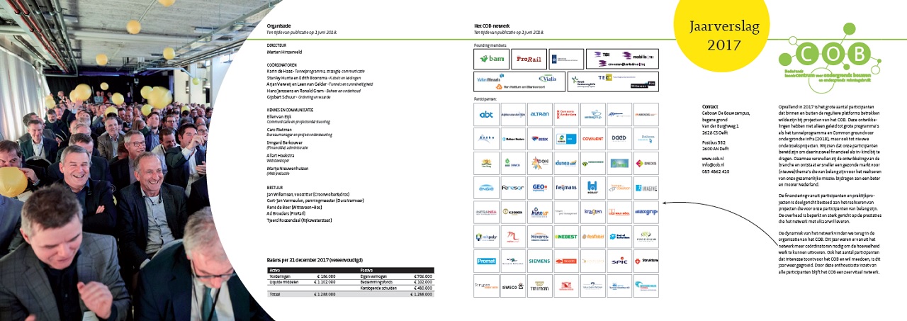 Opvallend in 2017 is het grote aantal participanten dat binnen en buiten de reguliere platforms betrokken wilde zijn bij projecten van het COB. Deze ontwikkelingen hebben niet alleen geleid tot grote programma’s als het tunnelprogramma en Common ground voor ondergrondse infra (2018), maar ook tot nieuwe onderzoeksprojecten. Wij zien dat onze participanten bereid zijn om daarin zowel financieel als in-kind bij te dragen. Daarmee versnellen zij de ontwikkeling van de branche en ontstaat er sneller een gezonde markt voor (nieuwe)thema’s die van belang zijn voor het realiseren van onze gezamenlijke missie: bijdragen aan een beter en mooier Nederland.