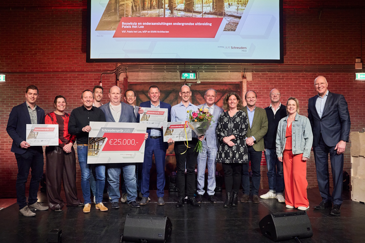 Toen nóg een moment waar veel deelnemers naar hadden uitgekeken. De uitreiking van de Schreudersprijs. Onder luid applaus werd als eerste de publieksprijs uitgereikt. Winnaar van deze nieuwe publieksprijs was de Blankenburgverbinding. Vervolgens nam juryvoorzitter Mandy Korff de aanwezigen mee in de overwegingen van de jury. “Het lijkt een trend dat er een steeds hogere kwaliteit is in techniek, maar ook in vormgeving,” aldus Mandy Korff. Geen makkelijke beslissing dus. Maar na een eervolle samenvatting van de drie genomineerde inzendingen werd dan toch de winnaar bekendgemaakt: de ondergrondse uitbreiding van Paleis Het Loo (door VSF, Paleis het Loo, WSP en KAAN Architecten).