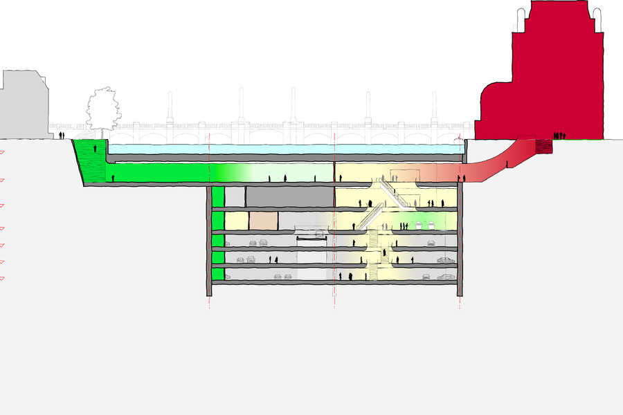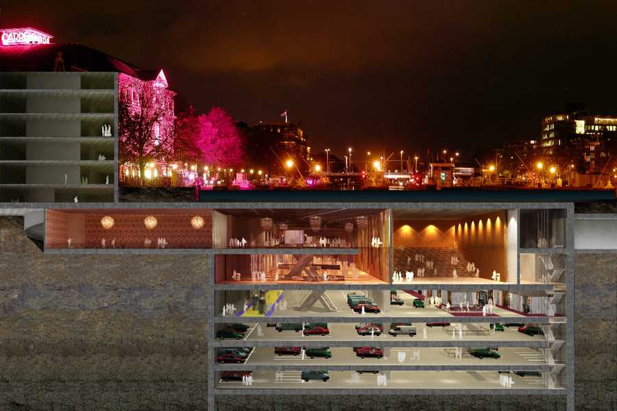 Het ondergrondse gangenstelsel telt zes lagen. Daarvan worden maximaal drie lagen gebruikt voor het verkeersnetwerk en parkeervoorzieningen. De resterende lagen zijn bestemd voor andere functies zoals winkels, restaurants, sportzalen, bioscopen, bevoorrading, archiefopslag, schuilkelder, kabel- en leidingentunnels en bijvoorbeeld geautomatiseerd personentransport. Door de keuze voor een kolomloze constructie met een maximale overspanning van ongeveer dertig meter is de vrijheid bij het indelen van de ondergrondse ruimten groot. Om ervoor te zorgen dat mensen eenvoudig en snel vanuit de ondergrondse ruimte de bovengrond kunnen bereiken en vice versa, komt er een fijnmazig net van opgangen met trappen en liften.