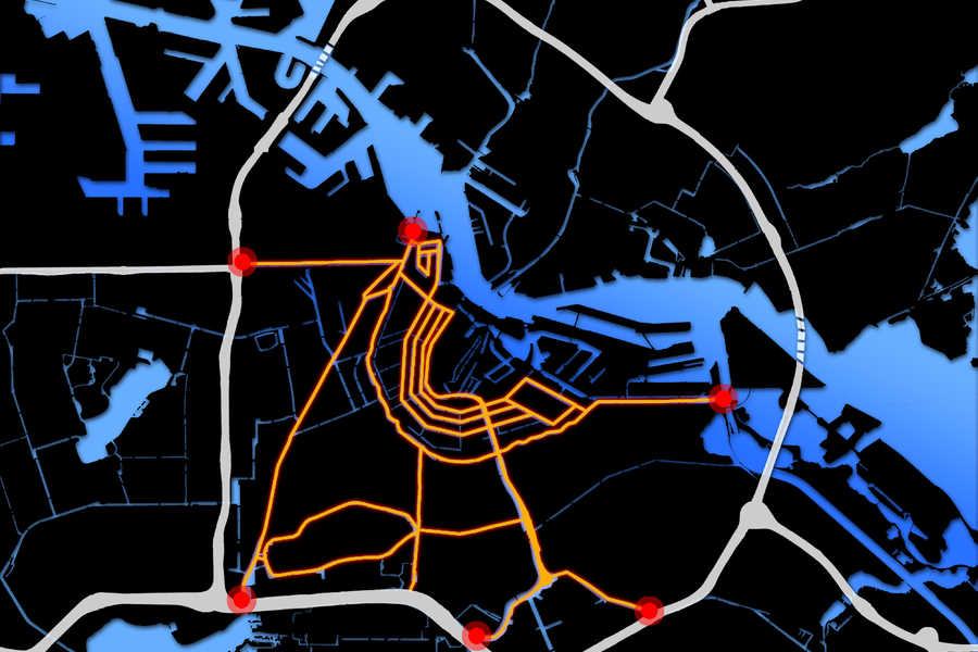 Het ondergrondse verkeersnetwerk (oranje) sluit op een aantal punten aan op de Ringweg A10. (Beeld: ZJA Zwarts & Jansma Architecten)