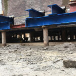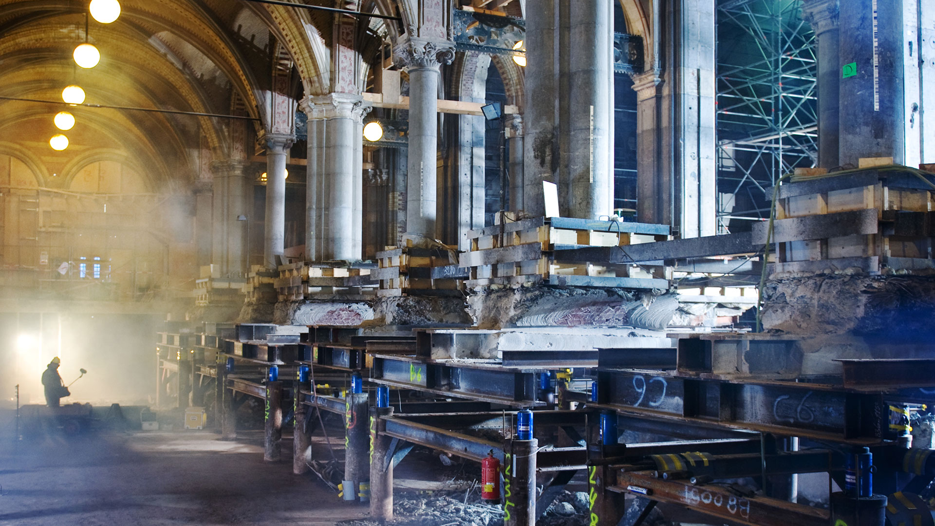 Rond elke kolom is een stalen frame gebouwd dat zijn krachten afdroeg naar tijdelijke buispalen. Op het frame zijn vijzels geplaatst. Deze ondersteunden stalen balken die door de poeren waren aangebracht. Aangezien de vloer van de passage – die zorgde voor de horizontale stabiliteit – werd verwijderd, is een stalen stabiliteitsframe tussen de bovengelegen metselkolommen gemaakt. Door de vijzels gecontroleerd en stapsgewijs iets op te draaien kon de belasting geleidelijk worden overgebracht naar het draagframe. Vervolgens zijn de poeren gesloopt en de nieuwe kolommen gemaakt. Daarna is de gebouwbelasting weer teruggebracht naar de oorspronkelijke fundering en is een nieuwe passagevloer gemaakt.