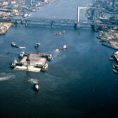 Artist impression van de skyline vanuit de Vlietzone. Op het dak van de tunnel zijn de geplande zonnepanelen te zien. (Beeld: Rotterdamsebaan)