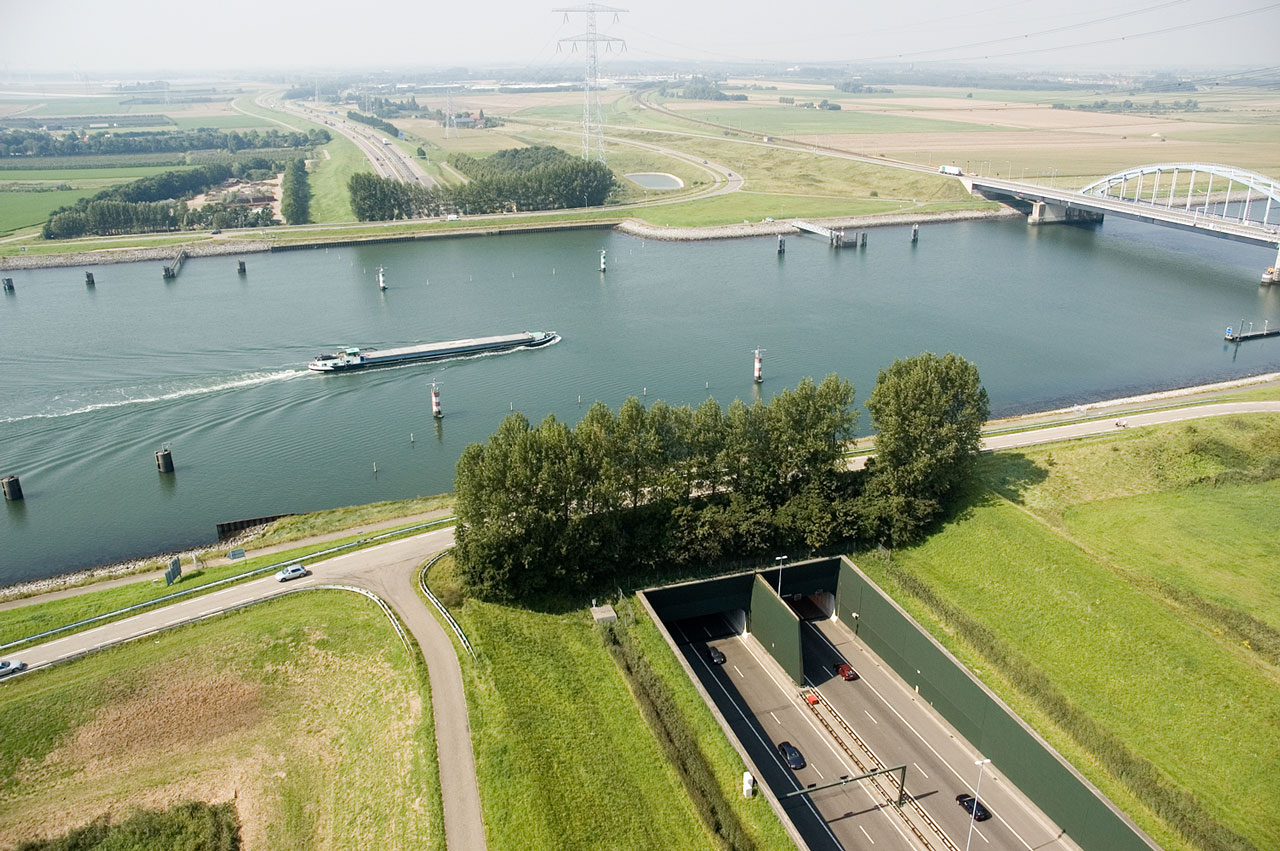De tunnel is gebouwd volgens de afzinkmethode. In een bouwdok aan de westzijde van het kanaal zijn hiervoor twee tunnelelementen gebouwd van elk 125 meter lang en bijna 30 meter breed. De uitsparing van het bouwdok is in 1980 opgenomen in het verbrede kanaal. De toeritten zijn gebouwd in droge bouwputten. Voor het afzinken van de tunnelelementen is in het kanaal een geul gebaggerd. Bij het afzinken zijn de elementen op een tijdelijke fundering geplaatst, 0,8 meter boven de bodem. Vervolgens is met een leiding door de bodem van de elementen funderingszand onder de tunnelelementen gespoten. Deze door Ballast Nedam ontwikkelde methode wordt ‘onderstromen’ genoemd en wordt sindsdien bij de meeste afzinktunnels toegepast. Onderstromen heeft in vergelijking met het eerder toegepaste ‘onderspoelen’ – waarbij zand van buitenaf onder en naast de tunnelelementen wordt gespoten – het voordeel dat het ook kan worden toegepast op grote diepten en bij sterke stroming.