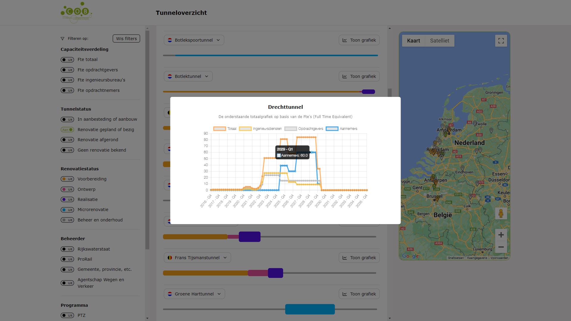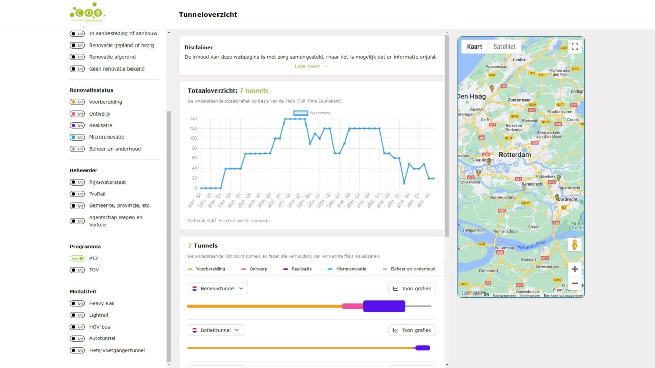 Vanuit de branche bleek er behoefte aan duidelijkheid over hoeveel werk er de komende jaren wordt verwacht bij de renovatie van tunnels. Daarom heeft het COB-netwerk gezorgd voor nadere duiding en verdieping van de gezamenlijke tunnelopgave. Met behulp van tunnelbeheerders en projectleden van renovaties is er een benadering van de toekomstige werkelijkheid gecreëerd in een online tunneloverzicht.