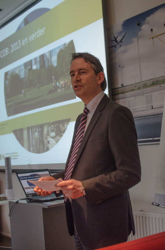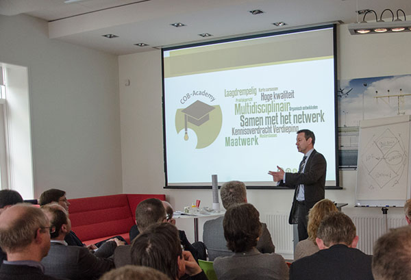 De laatste presentatie werd gegeven door COB-coördinator Richard van Ravesteijn. Hij introduceerde de COB-Academy, een nieuw concept om de kennis die binnen het COB is en nog wordt ontwikkeld, beter toegepast te krijgen in de praktijk. “Tot nu toe worden de meeste projecten afgesloten met een rapport. De kennis komt terecht op de kennisbank en wordt ontsloten via de website, de Onderbouwing en congressen. We krijgen echter steeds vaker de vraag of we niet méér kunnen doen. Het blijkt soms lastig om de lessen uit een rapport daadwerkelijk in praktijk toe te passen. Dat was voor ons reden om de COB-Academy te initiëren.”
