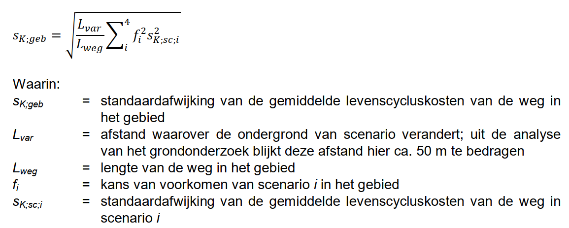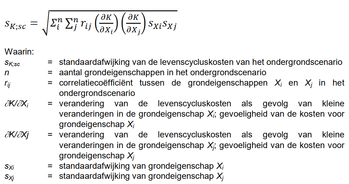 2. Bepaal voor elk ondergrondscenario de gemiddelde levenscycluskosten van de weg en de bandbreedte in de levenscycluskosten. De gemiddelde levenscycluskosten zijn de kosten die worden berekend op grond van de gemiddelde waarden van de grondeigenschappen in het ondergrondscenario. De bandbreedte is direct afhankelijk van de standaardafwijking van de levenscycluskosten. Deze standaardafwijking kan worden bepaald door middel van de gelineariseerde first order second moment (FOSM) methode: