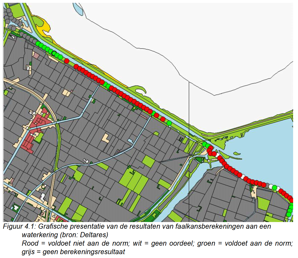 Onderstaand figuur geeft een voorbeeld van de presentatie van de resultaten van faalkansberekeningen aan een waterkering in het ‘dijkanalysemodel’ van Deltares.