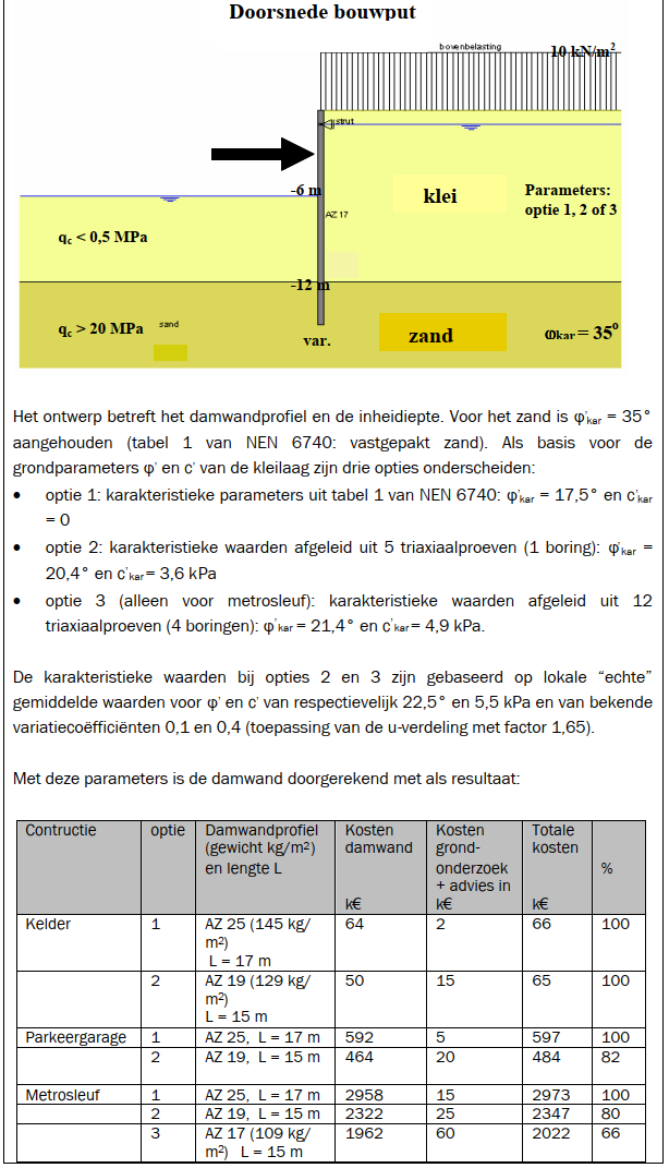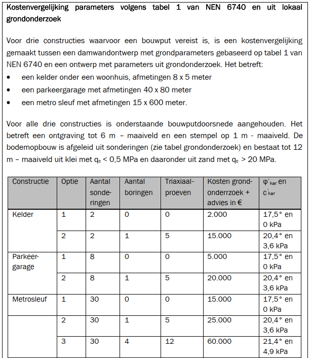 In CUR2008-2 Van onzekerheid naar betrouwbaarheid is in paragraaf 6.5 voorgerekend welk (financieel) voordeel extra grondonderzoek kan opleveren. Het blijkt dan dat (extra) grondonderzoek voor het ontwerp van de kleinere woonhuiskelder geen voordeel oplevert ten opzichte van een ontwerp met grondparameters volgens tabel 1 van NEN 6740. Voor de beide grotere constructies is dat zeker wel het geval. Bij het uitgebreide grondonderzoek voor de metrosleuf (optie 3) is de financiële winst zelfs 34%.