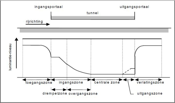 Verlichting in een tunnel is altijd nodig. Hiervoor worden door de hele tunnel verlichtingsarmaturen opgehangen. De basisverlichting is de verlichting die vanaf het begin tot het einde van het gesloten deel van de tunnel moet zorgen voor een verlichtingsniveau dat de gebruikers een goed zicht geeft. Deze basisverlichting wordt aan de ingang en eventueel aan de uitgang aangevuld met extra verlichting om de gebruikers te laten wennen aan het verlichtingsniveau in de tunnel. Deze extra verlichting is afhankelijk van de hoeveelheid licht net vóór en eventueel net na de tunnel en wordt actief geregeld. Een ingangszone is altijd benodigd, of een uitgangszone noodzakelijk is, hangt af van de passagetijd. Is deze tijd langer dan zo’n 30 seconden, dan wordt geadviseerd om aan het einde van de tunnel het verlichtingsniveau weer te verhogen.