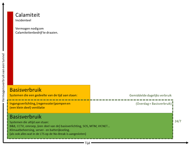 Elke tunnel kent een zeker verborgen energieverbruik. Denk aan zaken als nullastverliezen van transformatoren, carterverwarming van de noodstroomaggregaten (NSA), verliezen in de conversie van energie in de accusystemen (UPS), maar ook in kabelverliezen. Omdat systemen warmte produceren en/of geconditioneerd moeten worden, is er ook energie nodig voor klimaatbeheersing.