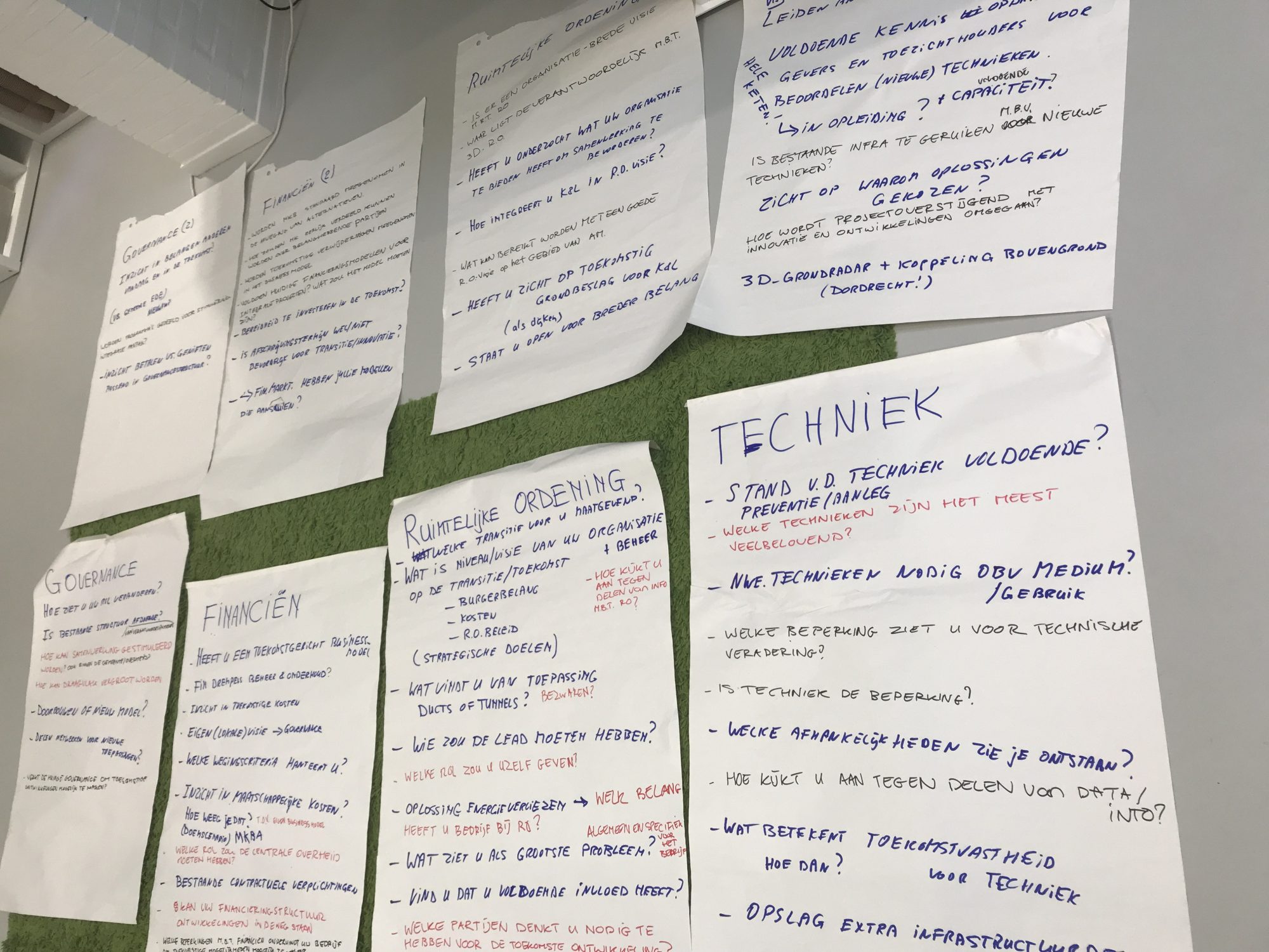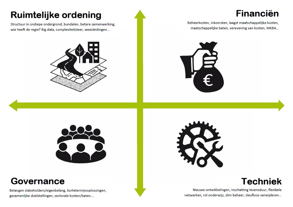 De belangrijkste ruimtelijke en maatschappelijke opgaven zijn de energietransitie, de klimaatopgave en de verdere verstedelijking. Nieuwe ondergrondse kabel- en leidingeninfrastructuur moet vaak worden ingepast in een complexe omgeving. Daarnaast zijn gasnetten en drinkwaternetten aan vervanging toe. De (lokale) opwekking van hernieuwbare energie en de opmars van elektrisch rijden maken uitbreiding van het stroomnet nodig. Extra rioleringen zijn nodig voor de afkoppeling van regenwater en de vraag naar datanetwerken blijft groeien. Al deze ontwikkelingen hebben een enorme impact op de ondergrondse netwerkinfrastructuur.