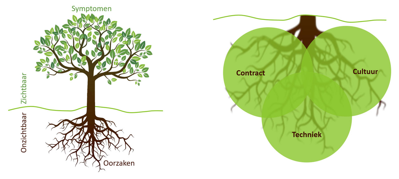 In dit project is een root-cause analysis gebruikt om tot effectieve oplossingen en/of maatregelen te komen. Om tijdens de analyse de problematiek vanuit verschillende facetten te belichten, zijn drie thema’s gedefinieerd. (Beeld: COB)